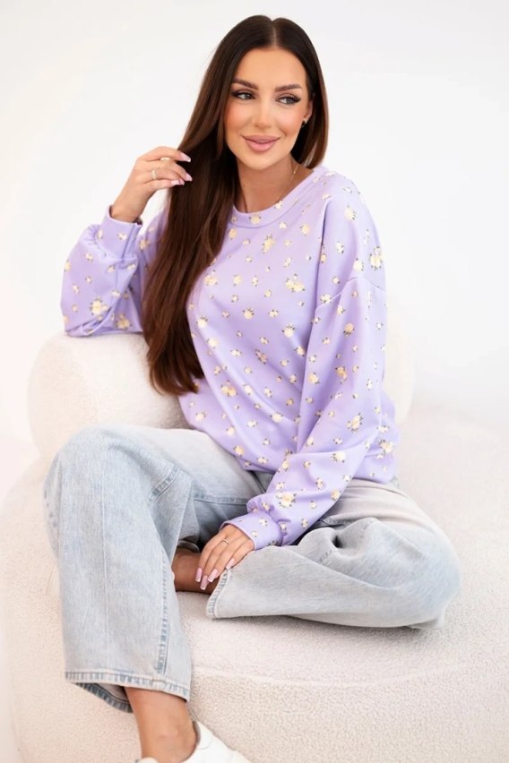 Bluza damska wiskozowa w drobne kwiatki z długim rękawem fioletowa