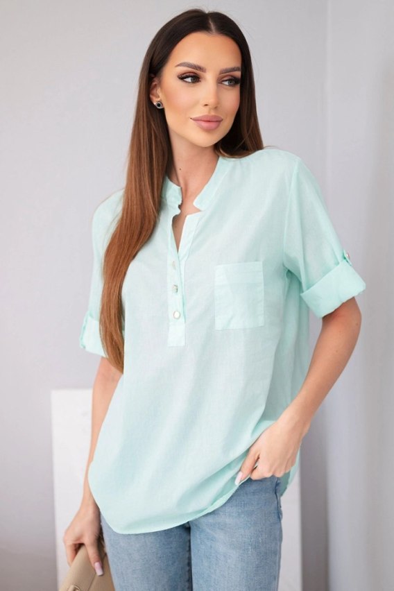 Koszula została wykonana z wysokiej jakości bawełny z dodatkiem elastanu, dzięki czemu materiał jest przyjemny w dotyku, przewiewny oraz dobrze dopasowuje się do sylwetki. Model posiada modny półokrągły dekolt z krótkim zapięciem na guziki, które dodaje jej eleganckiego charakteru. Praktyczna kieszonka na piersi oraz rękawy z możliwością podwinięcia i zapięcia na guzik podkreślają nowoczesny i funkcjonalny styl. To idealna koszula na wiosnę, lato oraz cieplejsze dni. Produkcja Włoska gwarantuje wysoką jakość wykonania i modny design inspirowany włoską modą.