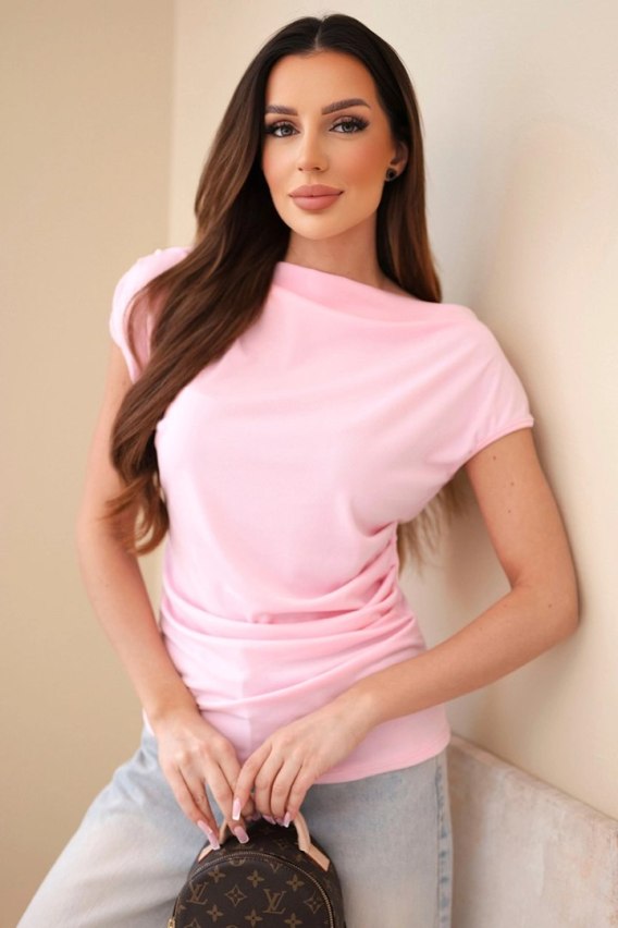 Bluzka damska prążkowana z wiskozy dekoltem woda i marszczeniem cukierkowy róż
