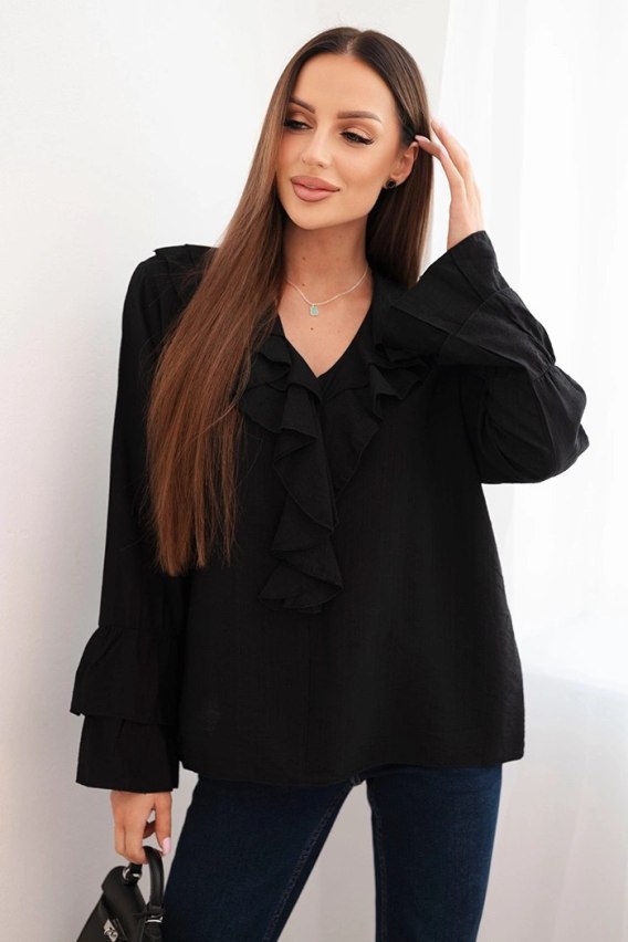 Bluzka damska z wiskozy z falbanami i długim rękawem czarna