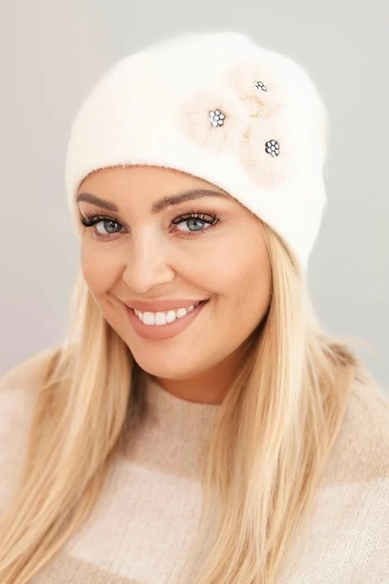 Czapka damska z ozdobnymi futrzanymi kwiatami elegancka ecru