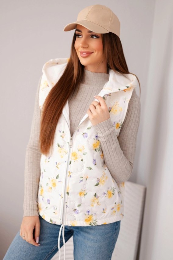 Kamizelka damska pikowana w kwiaty z kapturem żółta