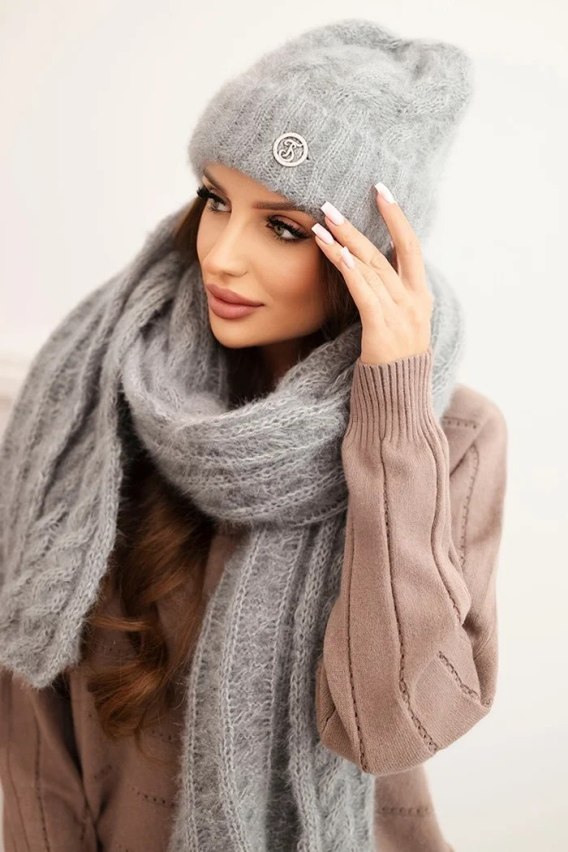 Komplet damski czapka i szalik prążkowany z ozdobą szary