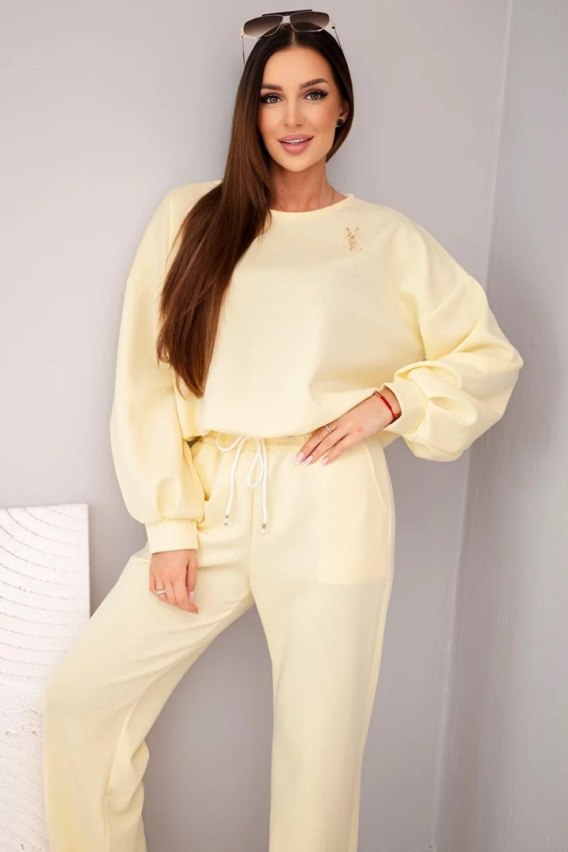 Komplet damski masełko bluza z broszką i spodnie z prostą nogawką żółty