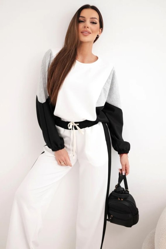 Bluza o luźnym kroju z obniżoną linią ramion i ściągaczem przy rękawach zapewnia swobodę ruchów oraz wyjątkową wygodę. Kontrastowe wstawki dodają jej modnego, nowoczesnego charakteru. Spodnie z elastycznym pasem i szeroką nogawką gwarantują komfort przez cały dzień, a ich minimalistyczny krój pięknie podkreśla sylwetkę.