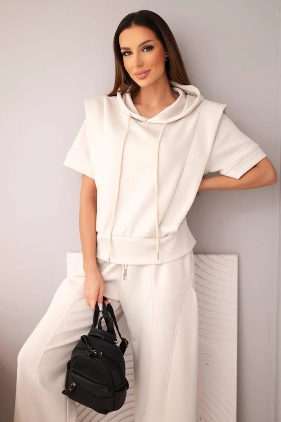 Komplet damski masełkowy bluza z kapturem i luźne spodnie z wiązaniem beżowy