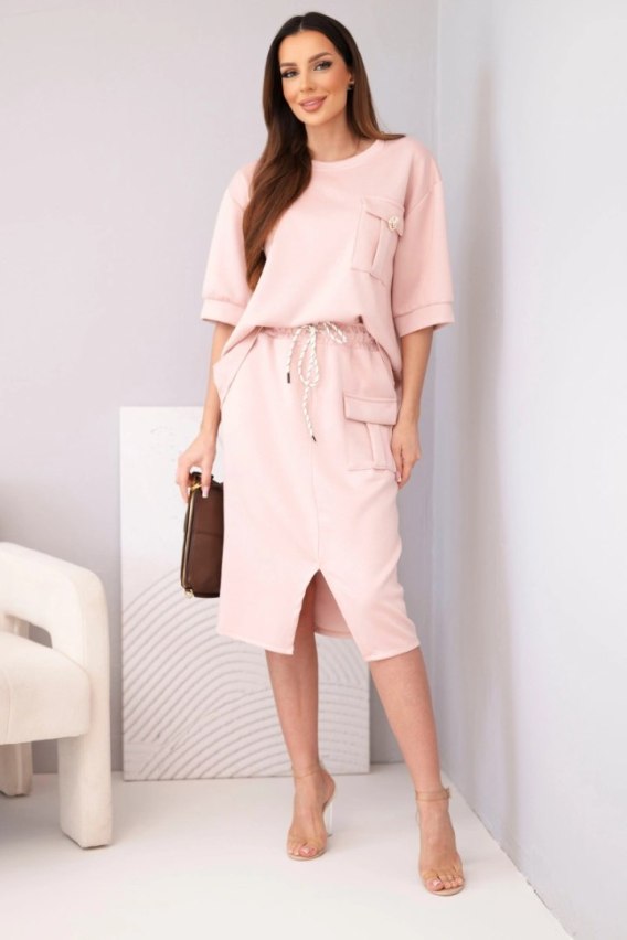 Komplet damski masełkowy z bluzką i spódnicą midi ciemny pudrowy róż