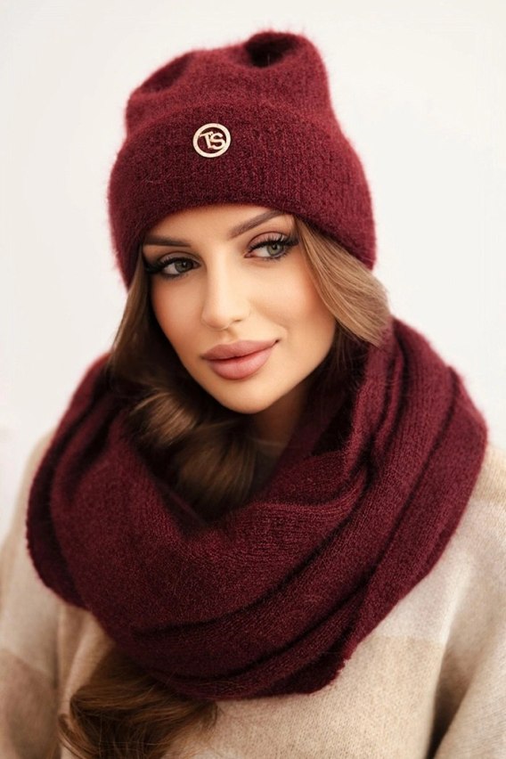 Komplet damski z czapką i kominem z miękkiej dzianiny bordowy