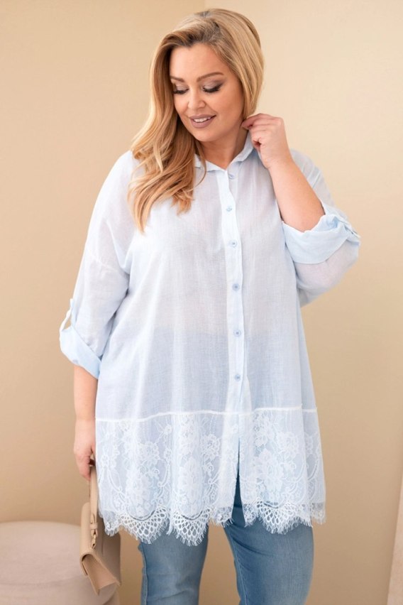 Koszula damska Plus Size bawełniana przecierana z koronkowym wykończeniem niebieska