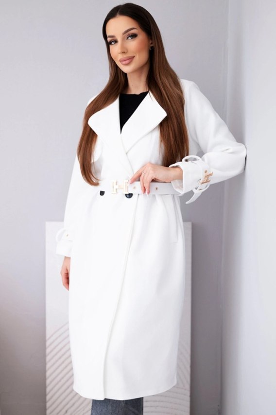 Płaszcz posiada klasyczny kołnierz oraz efektowne wykończenie rękawów z dekoracyjnymi klamrami, które przyciągają uwagę i podkreślają elegancki styl. Materiał jest miękki, przyjemny w dotyku i delikatnie elastyczny, dzięki czemu zapewnia komfort noszenia. Idealny do stylizacji codziennych, biznesowych oraz na specjalne okazje.