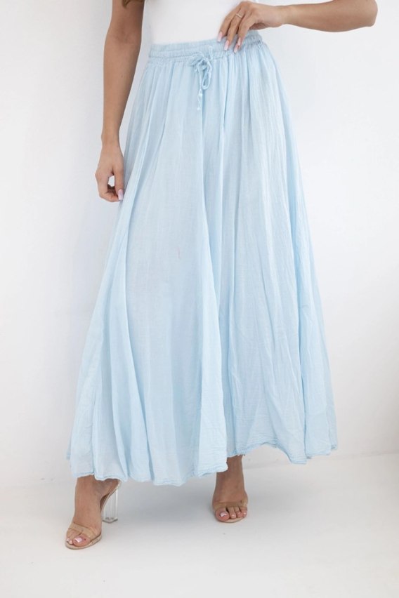 Zwiewna spódnica damska maxi to idealna propozycja na ciepłe dni. Model wykonany w 100% z bawełny jest lekki, przewiewny i bardzo komfortowy w noszeniu. Delikatnie marszczony materiał nadaje spódnicy modnego, naturalnego charakteru oraz pięknie układa się podczas ruchu.