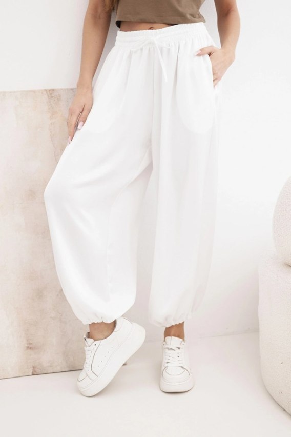 Spodnie damskie szerokie z gumką w pasie i wiązaniem typu alladynki ecru