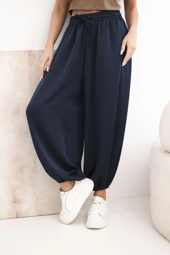 Spodnie damskie szerokie z gumką w pasie i wiązaniem typu alladynki granatowe