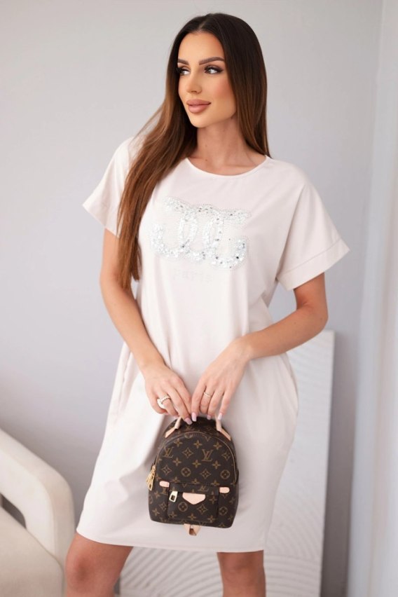 Sukienka damska wiskozowa z krótkim rękawem i ozdobnym nadrukiem beżowa