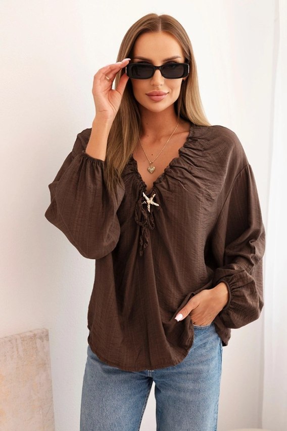 Ta bluzka damska z wiskozą to połączenie wygody i kobiecego stylu. Wykonana z lekkiej, przewiewnej tkaniny, świetnie sprawdzi się zarówno na co dzień, jak i na spotkania towarzyskie. Marszczony dekolt z regulacją i ozdobną zawieszką w kształcie gwiazdy przyciąga uwagę i nadaje oryginalnego charakteru.