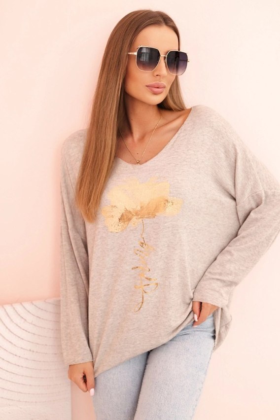 Bluzka damska z wiskozy z długim rękawem i złotym kwiatowym nadrukiem beżowy melanż
