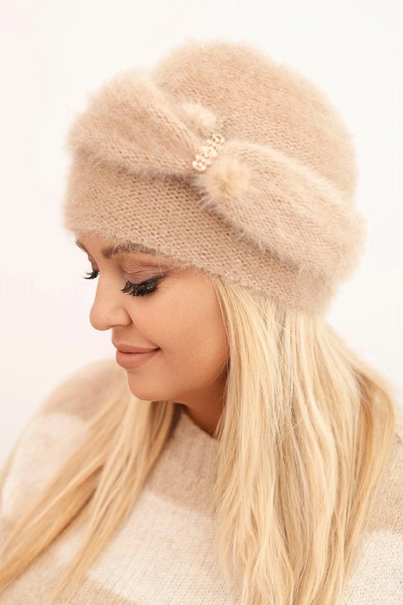 Czapka damska zimowa puszysta z ozdobą i futerkiem beżowa