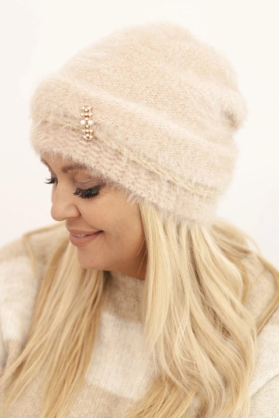Czapka damska zimowa puszysta z perełkami i ozdobnym splotem beżowa