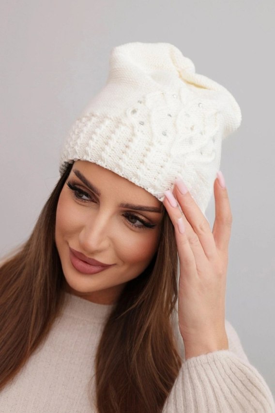 Czapka damska zimowa z wełną zdobiona cekinami i splotem K473 ecru