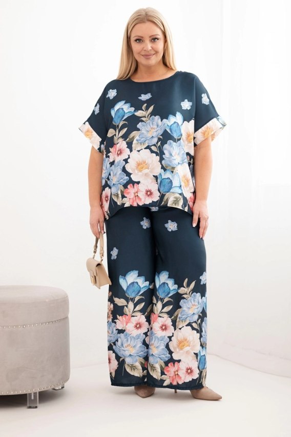 Komplet damski Plus Size z bluzką i spodniami w kwiaty z szeroką nogawką granatowy