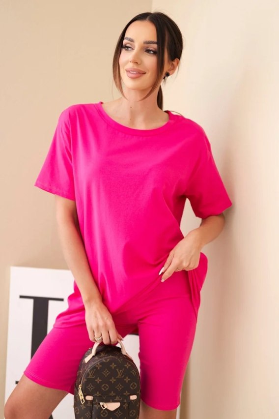 Komplet damski bawełniany z krótkim rękawem i dopasowanymi spodenkami fuksja