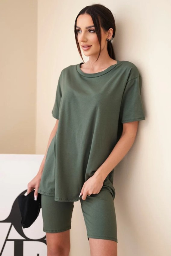 Komplet damski bawełniany z krótkim rękawem i dopasowanymi spodenkami khaki