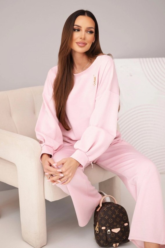 Komplet damski masełko bluza z broszką i spodnie z prostą nogawką ciemny pudrowy róż
