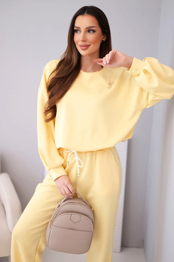 Komplet damski masełko bluza z broszką i spodnie z prostą nogawką ciemny żółty