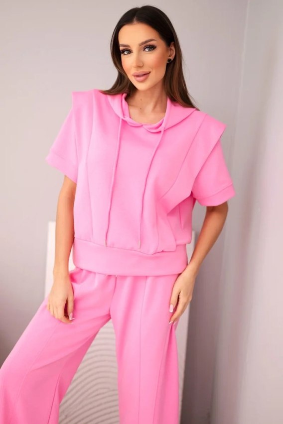 Komplet damski masełkowy bluza z kapturem i luźne spodnie z wiązaniem jasny różowy