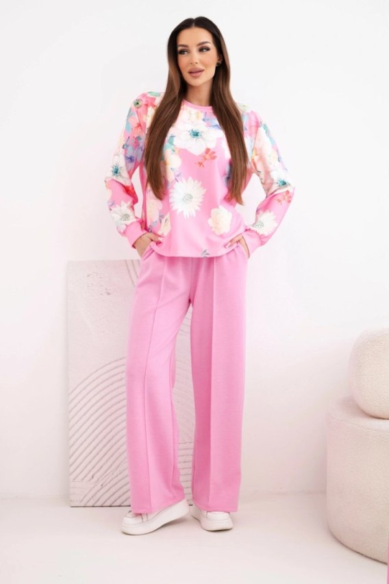 Komplet damski masełkowy wiskozowy w kwiaty z szeroką nogawką jasno różowy