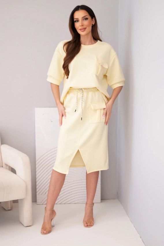 Stylowy komplet damski masełkowy to idealna propozycja dla kobiet, które cenią sobie wygodę i modny wygląd w jednym. Zestaw składa się z luźnej bluzki z krótkim rękawem oraz dopasowanej spódnicy midi z elastyczną talią. Gładki materiał o przyjemnej, miękkiej strukturze pięknie układa się na sylwetce i zapewnia komfort noszenia przez cały dzień. Ozdobna kieszeń typu cargo na bluzce i spódnicy nadaje całości nowoczesnego charakteru, a wiązanie w pasie podkreśla kobiecą sylwetkę.