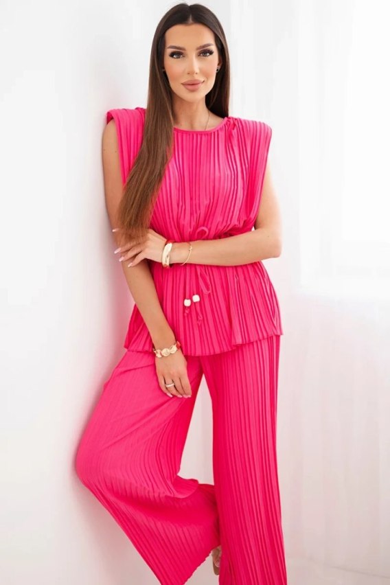 Komplet damski wiskozowy plisowany z wiązaną bluzką i szerokimi spodniami różowy