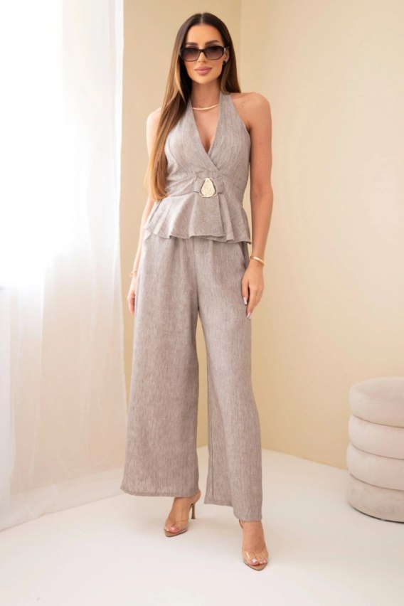 Elegancki i stylowy komplet damski to doskonała propozycja dla kobiet, które cenią modne, a jednocześnie wygodne rozwiązania. Zestaw składa się z efektownego topu oraz spodni o szerokiej nogawce, które razem tworzą spójną i bardzo kobiecą stylizację. Góra kompletu wyróżnia się głębokim dekoltem oraz wiązaniem na szyi, co pięknie podkreśla sylwetkę i dodaje całości zmysłowego charakteru. Dodatkowym atutem jest ozdobna klamra w talii, która modeluje figurę i przyciąga uwagę.