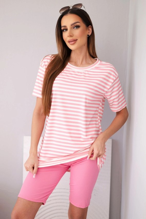 Komplet damski wiskozowy w paski z krótkim rękawem i spodenkami jasno różowy