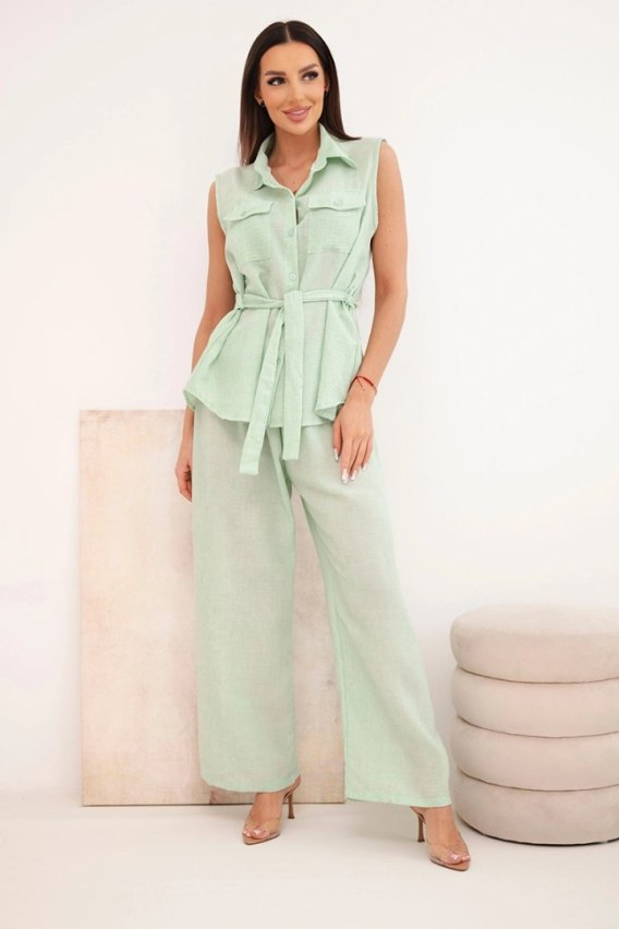 Komplet damski z wiązaną bluzką i szerokimi spodniami miętowy