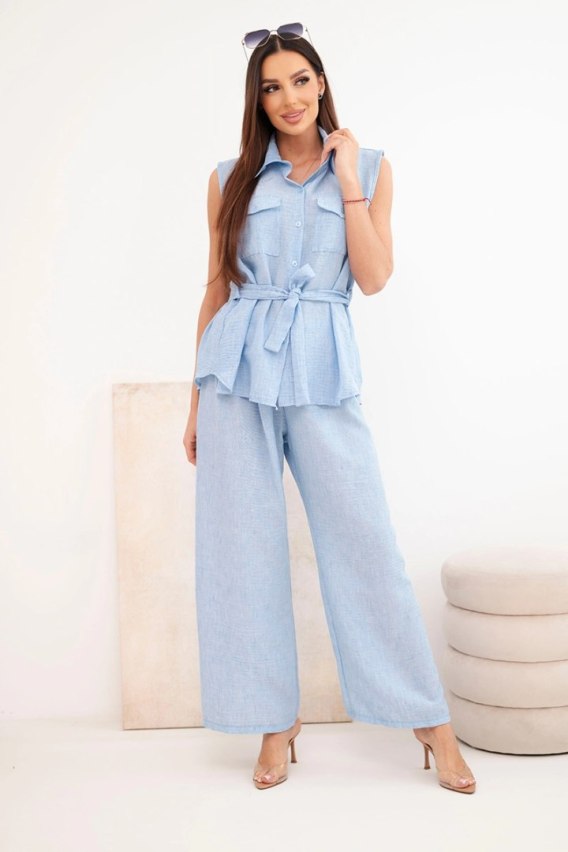 Stylowy komplet damski to doskonała propozycja dla kobiet, które cenią wygodę, modny wygląd i uniwersalne rozwiązania w codziennych stylizacjach. Model składa się z bluzki bez rękawów zapinanej na guziki oraz długich spodni o szerokiej nogawce, dzięki czemu całość prezentuje się lekko, kobieco i bardzo nowocześnie. Dodatkowym atutem bluzki jest klasyczny kołnierzyk, kieszonki na piersi oraz pasek do wiązania w talii, który pięknie podkreśla sylwetkę. Spodnie posiadają wygodną gumkę w pasie, co zapewnia komfort noszenia i dobre dopasowanie do figury.