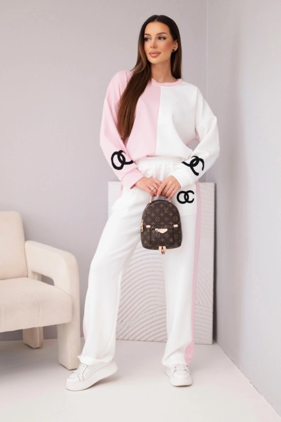 Komplet dresowy damski Masełko dwukolorowy z bluzą oversize i prostymi spodniami pudrowy róż+biały