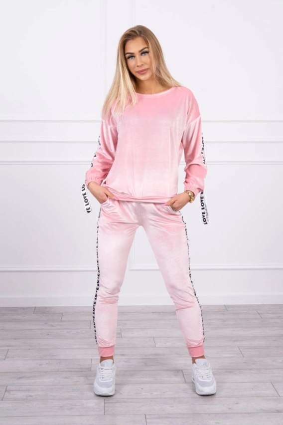 Prezentujemy Państwu komplet bluzy i spodni. Komplet wykonany z weluru. Bluza posiada taśmy z napisem Love. Spodnie z kieszeniami oraz wiązanie w pasie. Bardzo modny i stylowy komplet. Komplet wykonany jest z wysokiej jakości materiału. Rozmiar jest uniwersalny i będzie odpowiedni dla Pań w rozmiarze S, M lub L.