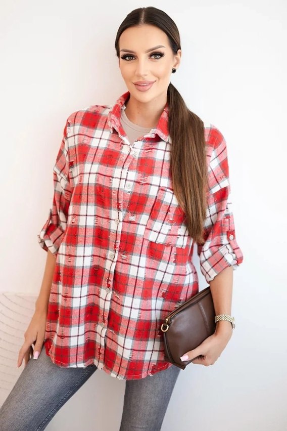 Koszula damska bawełniana w kratę z efektem przetarć czerwona