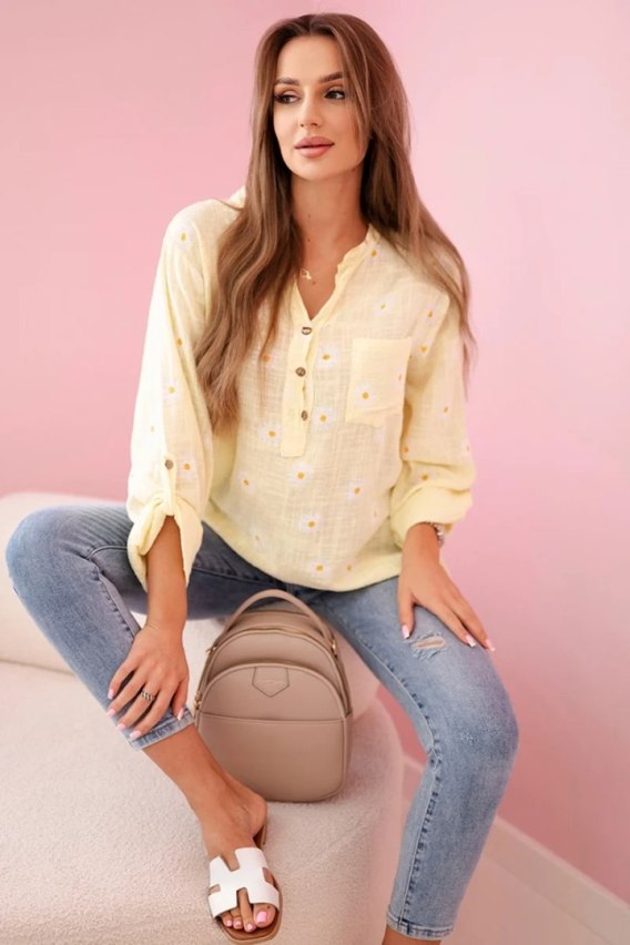 Lniana damska bluzka w kwiaty z długim rękawem i guzikami żółta