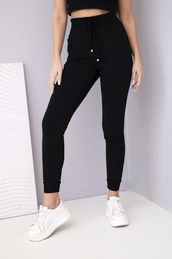 Spodnie damskie dresowe bawełniane z wysokim stanem i wiązaniem czarne