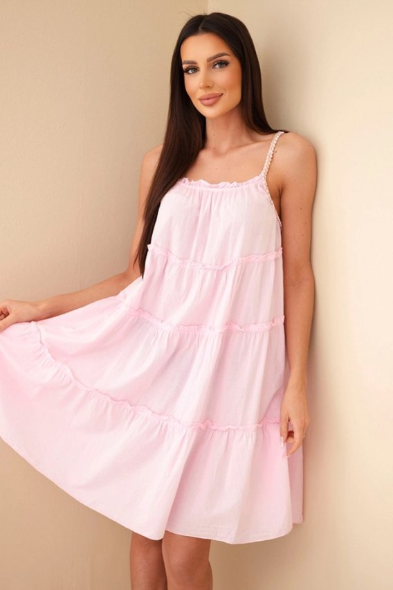 Sukienka damska bawełniana na ramiączkach z falbanami cukierkowy róż