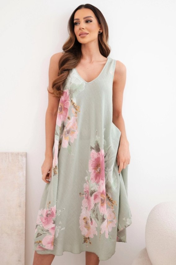 Model wyróżnia się subtelnym dekoltem w kształcie litery V oraz efektownym kwiatowym nadrukiem, który nadaje całości romantycznego charakteru. To doskonały wybór dla kobiet ceniących modny wygląd i wygodę w jednym. Sukienka świetnie komponuje się zarówno z sandałami, jak i sportowym obuwiem, tworząc stylizacje na różne okazje.