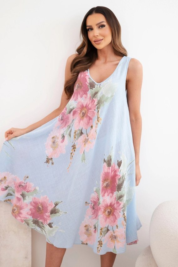 Sukienka damska bawełniana oversize z dekoltem V i kwiatowym nadrukiem niebieska