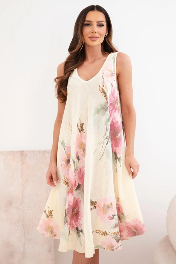 Model wyróżnia się subtelnym dekoltem w kształcie litery V oraz efektownym kwiatowym nadrukiem, który nadaje całości romantycznego charakteru. To doskonały wybór dla kobiet ceniących modny wygląd i wygodę w jednym. Sukienka świetnie komponuje się zarówno z sandałami, jak i sportowym obuwiem, tworząc stylizacje na różne okazje.