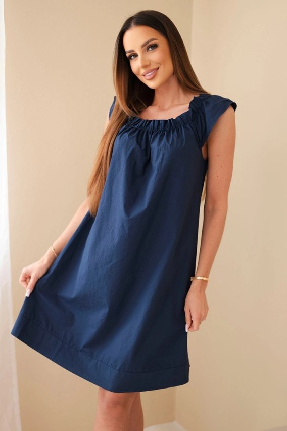 Sukienka damska bawełniana z marszczonym dekoltem i falbanką granatowa