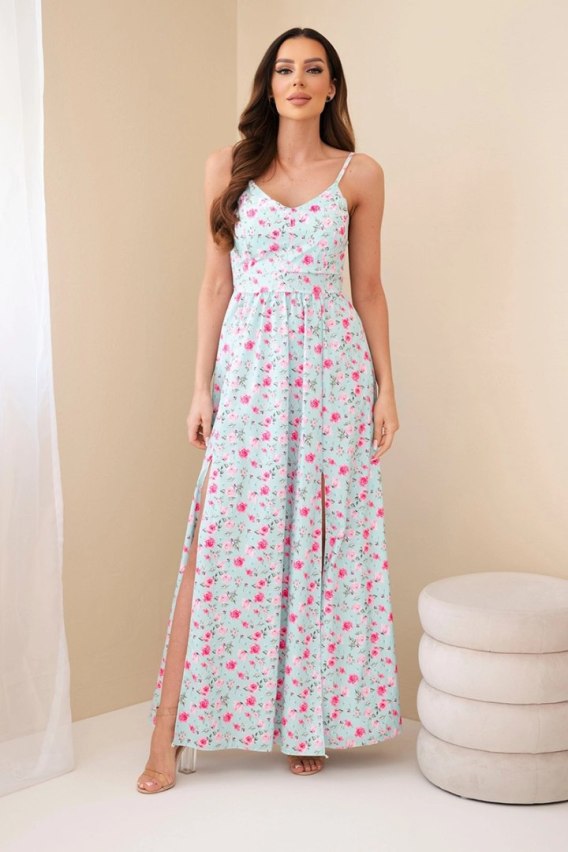 Sukienka damska maxi w kwiaty na ramiączkach z wiązaniem na plecach miętowa