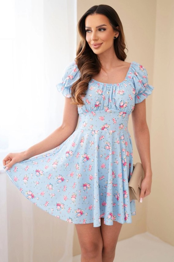 Sukienka damska w kwiaty z bufiastym rękawem i elastyczną talią niebieska