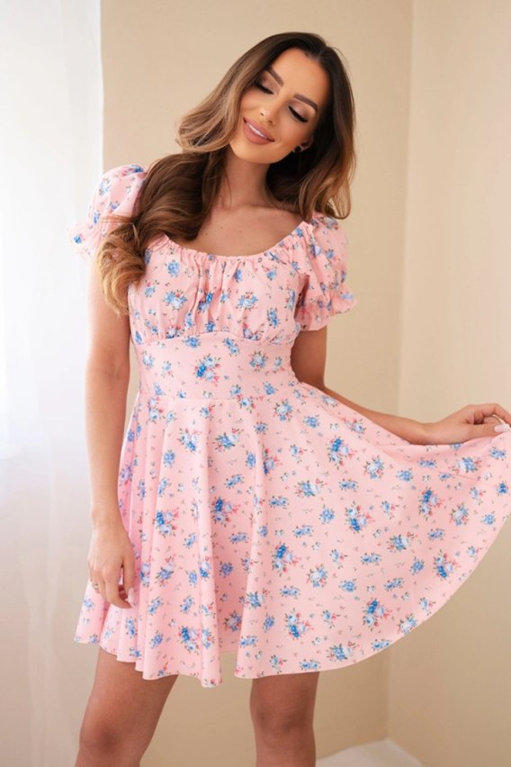 Sukienka damska w kwiaty z bufiastym rękawem i elastyczną talią pudrowy róż