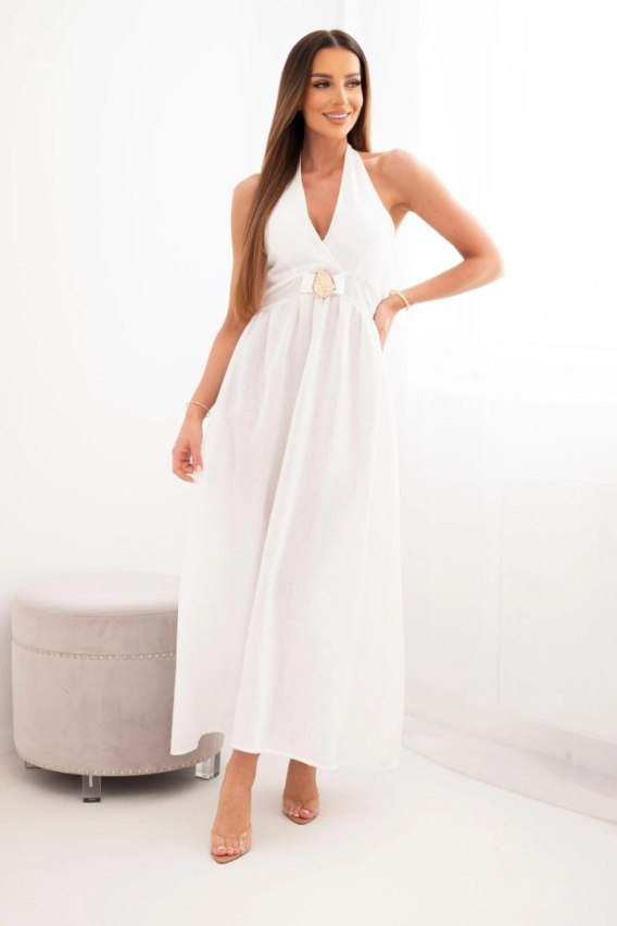 Sukienka damska wiskozowa maxi wiązana na szyi z ozdobną klamrą ecru